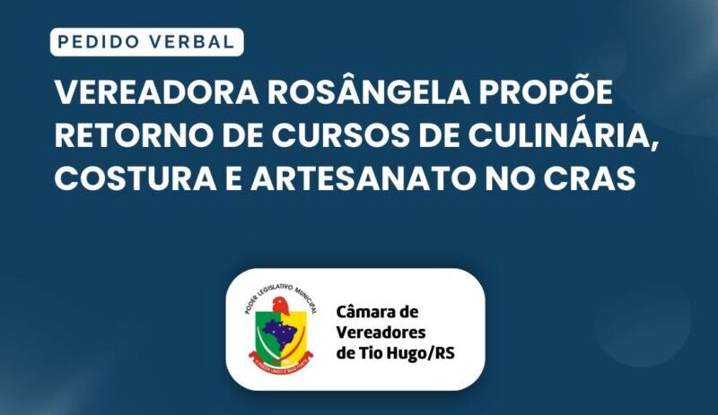 Por meio de um pedido verbal apresentado na sessão ordinária da Câmara Municipal de Tio Hugo de segunda-feira (25/08), a vereadora Rosangela Luíza Vicari (PL) recomendou ao Poder Executivo que, por meio da Secretaria de Assistência Social e do CRAS, sejam retomados os cursos de culinária, costura, artesanato e outras capacitações de interesse da comunidade.